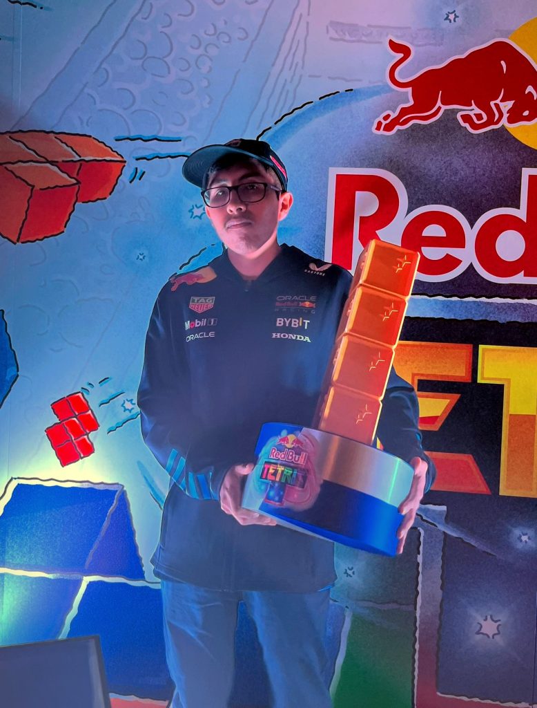 Leo Solórzano (Alkaline) sosteniendo la copa del Torneo Red Bull Tetris®.